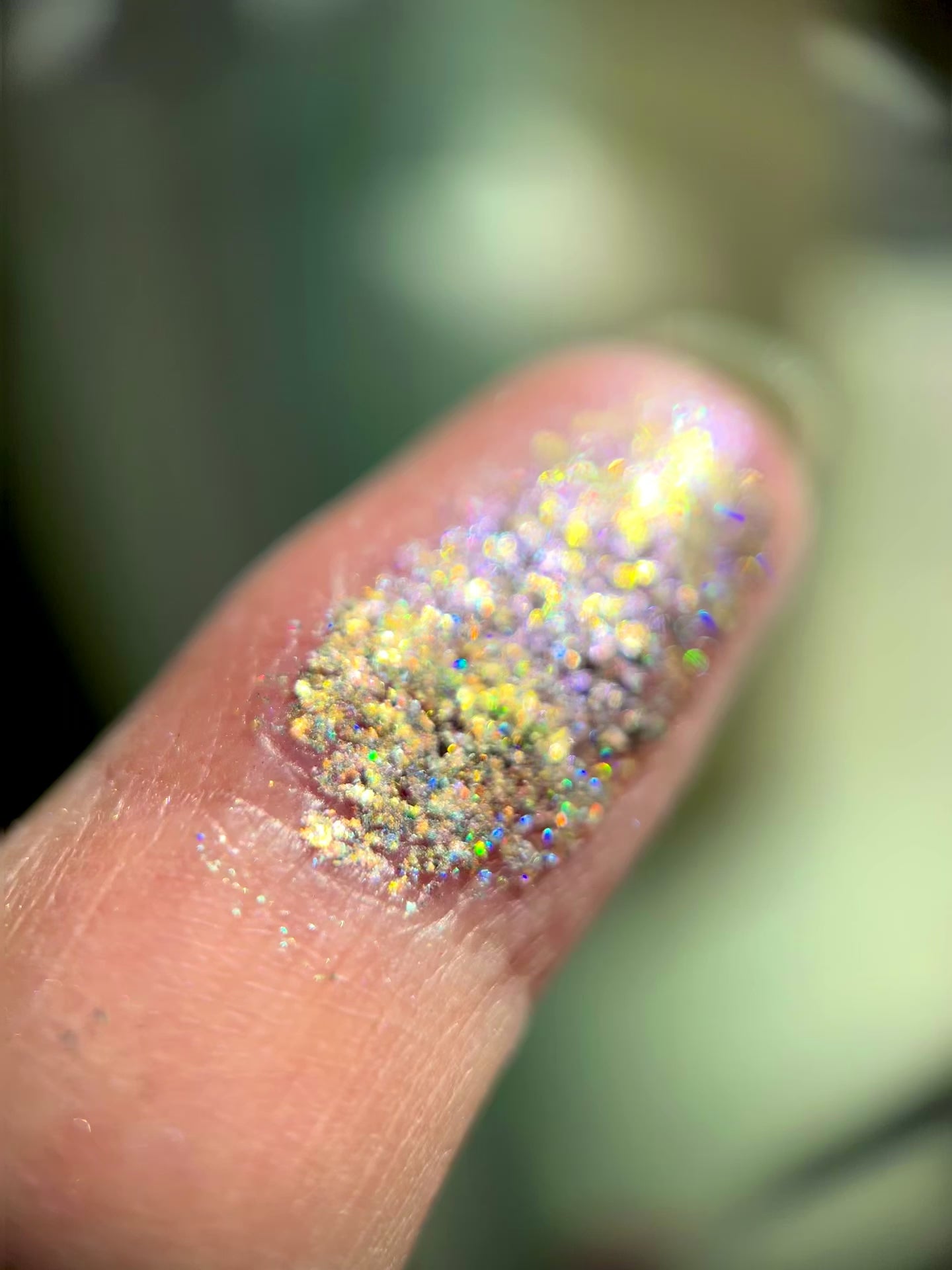 Secondary Shifts/Reflects: Aqua blue, emerald green, and teal micro-shimmers flicker at sharp angles.Flecks of magenta, coral pink, sunset orange, and sky blue create a subtle rainbow arc through the gold.