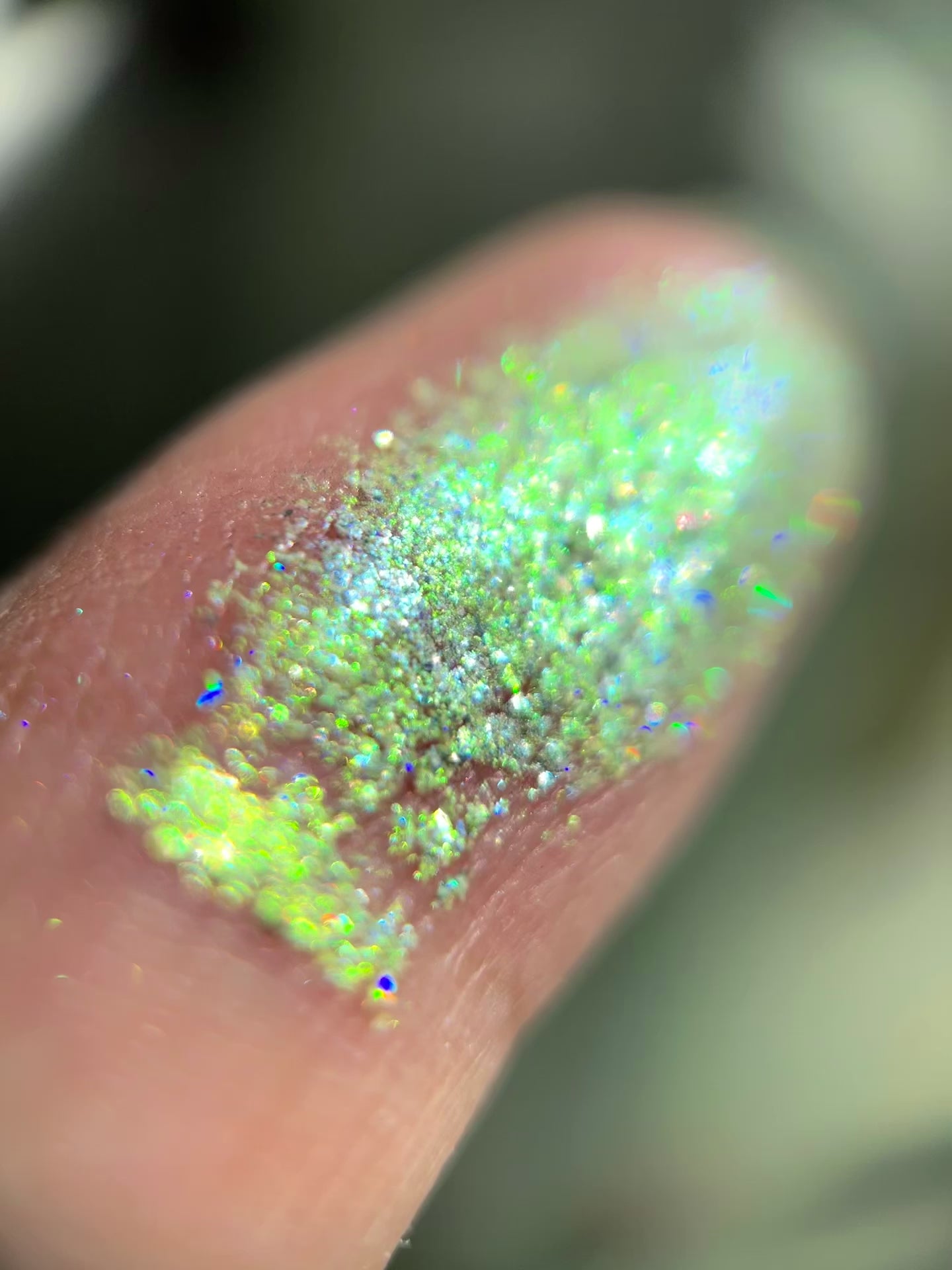 Ghoul Glam Holo: A ghoulish but glamorous radiance that transforms from electric lime to aqua blue under shifting light, wrapped in a rainbow halo of holographic brilliance.