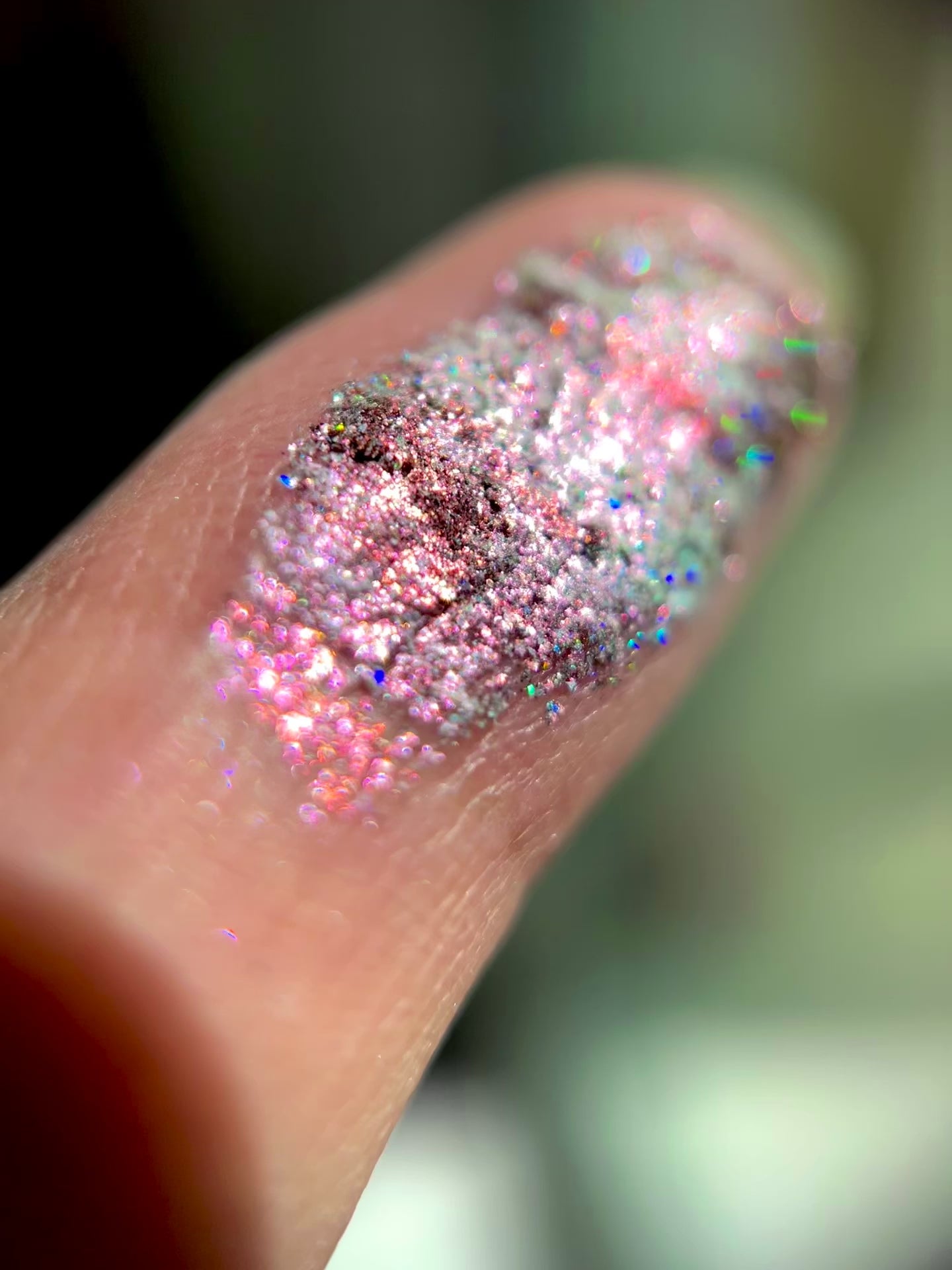Dethwish Holo:A romantic rosey stardust finish that shifts from warm blush and champagne rose to icy lilac and silver holographic sparks. It glimmers like crushed moonlight kissed with rose gold
